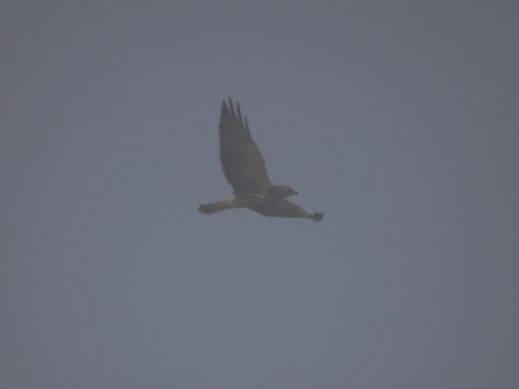 The fog was dense, but this juvenile Swainson’s Hawk appeared out of the haze a couple times. Photo by Clay Bliznick.